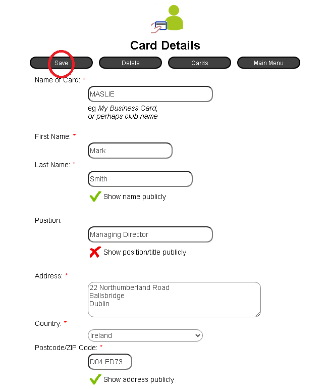 Add all of your details, and remember to set a “green tick” next to those details you wish to publish. This is to meet the EU’s GDPR requirement of permission for us to promote your details.