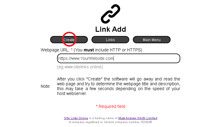 Then click “Create”. Note: That there is a pause while the system goes away and reads your webpage. This is to determine the webpages title, description and keywords. These will be pre-populated on the next screen.