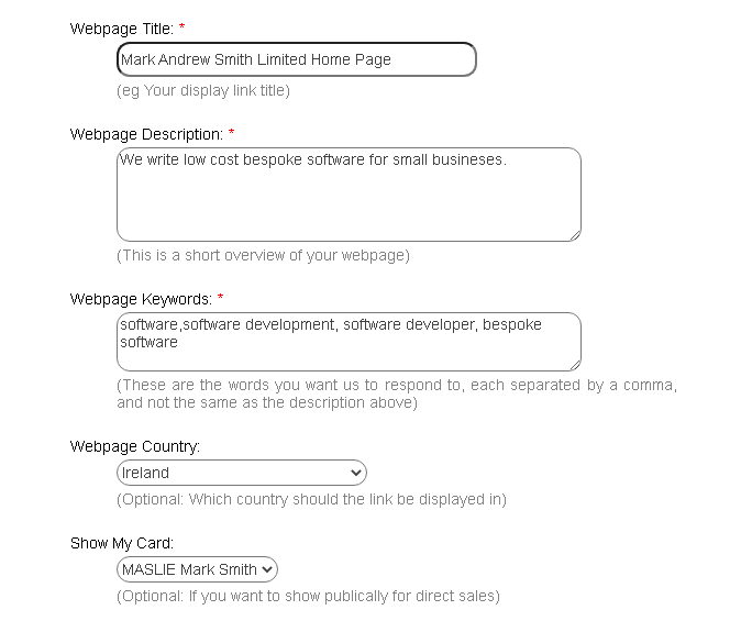 You can test your keywords are working by using the search function at https://www.SiteLinks.Online/search/ and entering one of your keyword searches. From the example above try “bespoke software” and then click search. If you have set the optional business card to be displayed, then it will be included as well along with your uploaded company logo.